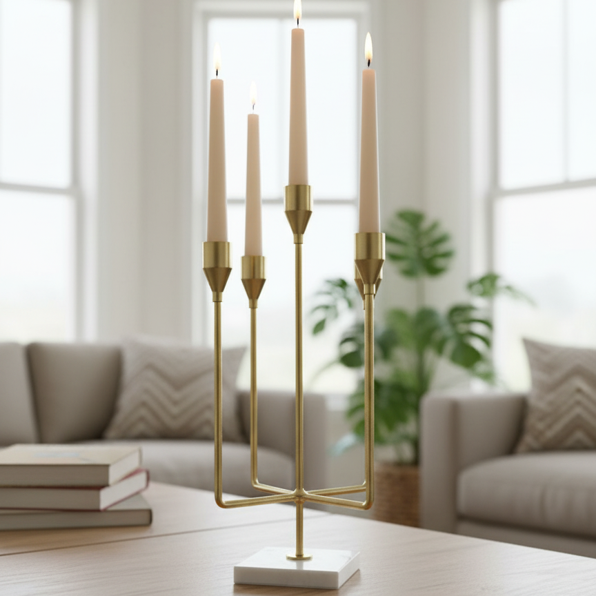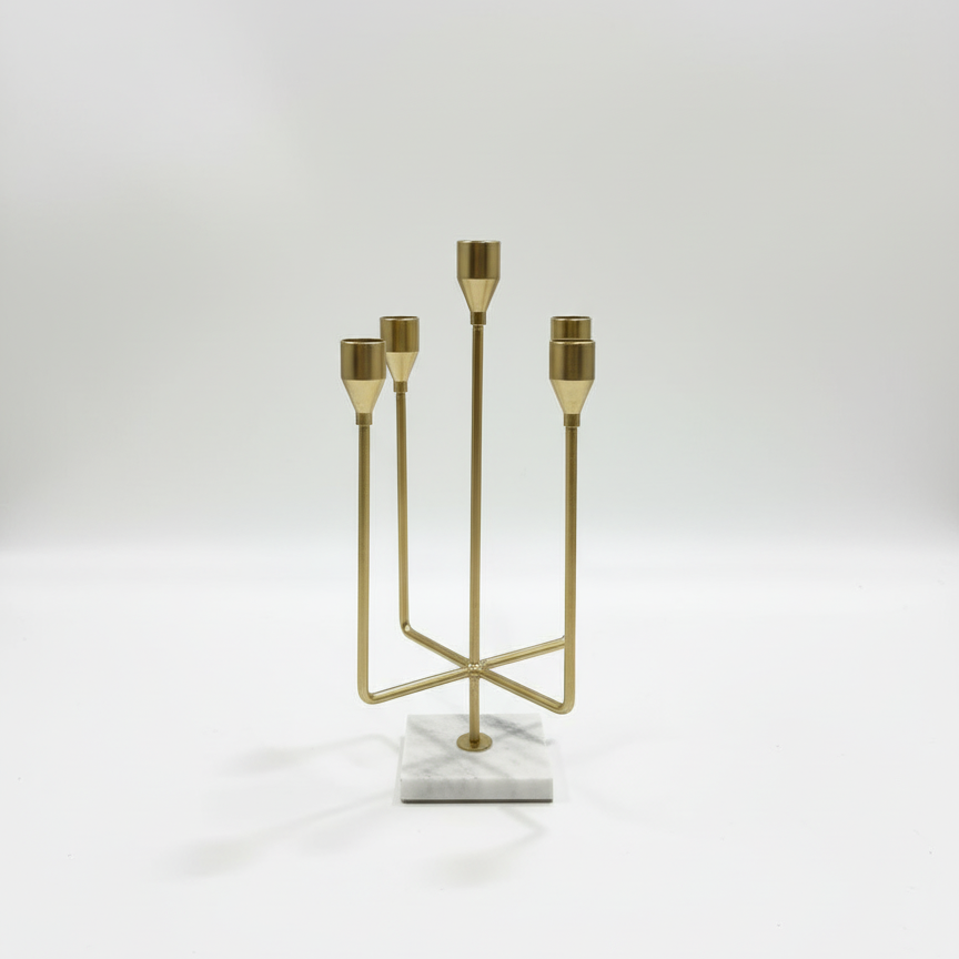 Sculpted luminescence. Polished brass columns rise dynamically from a solid marble base. This four-arm piece uses varying heights to create a striking architectural silhouette. Elevate any console or centerpiece with this essential modern classic.