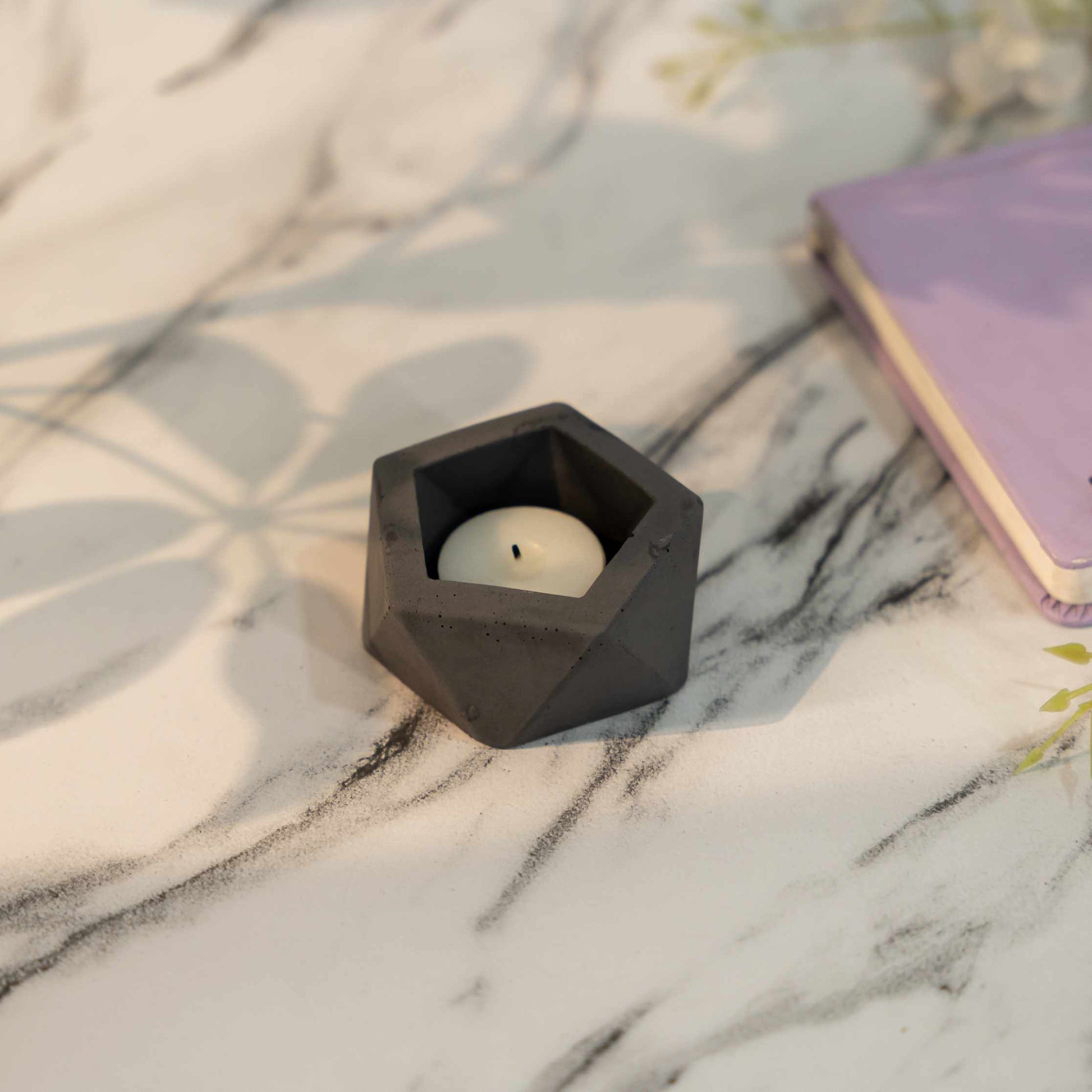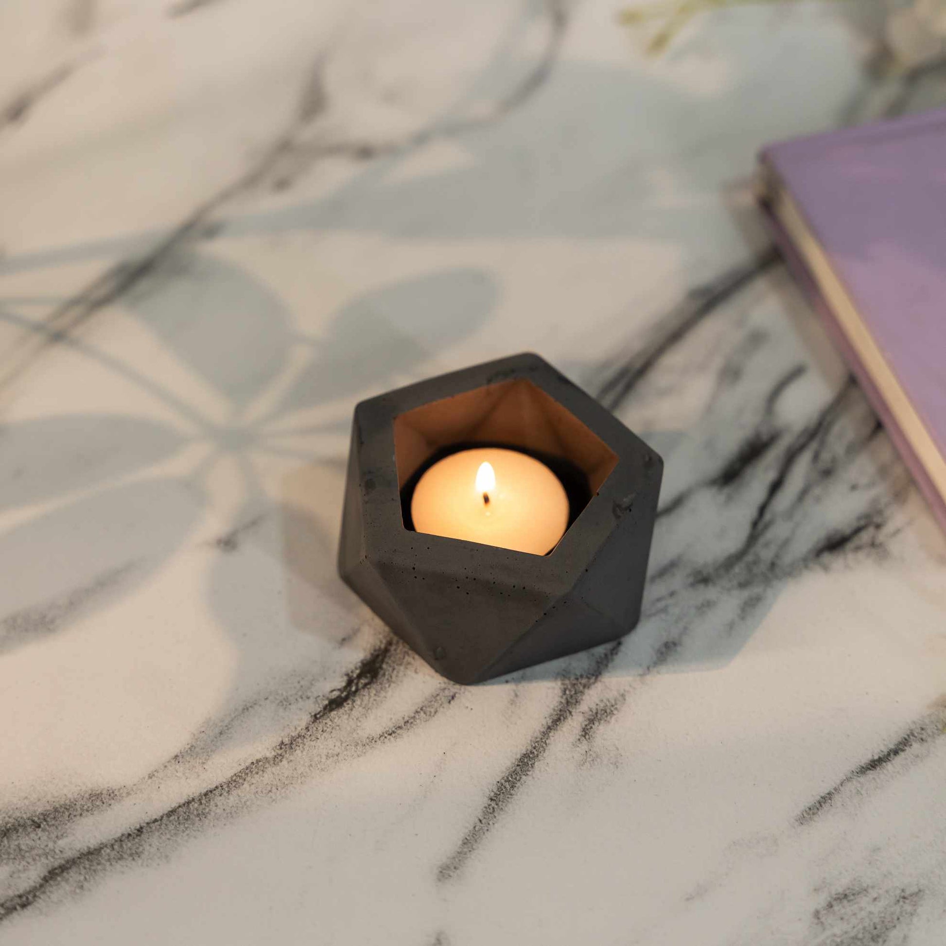 Each facet of this candle holder is meticulously constructed from sturdy concrete, offering a raw and tactile quality that's both robust and visually appealing. The concrete's natural grey tone imparts an earthy, urban charm, making it a versatile addition to any interior design scheme.