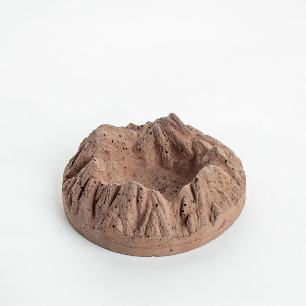 The Konder or Kondyer Massif is a circular igneous rock intrusion in Eastern Siberia, Russia. It has a massive 8-kilometer diameter. Nature inspires us to think creatively and gives us fresher and newer perspectives in every tryst, and we never miss a chance to make the most out of it. We have made many scale models as architects and have thoroughly enjoyed them. Based on the foregoing and inspiration from the Kondyor Massif, we curated and handcasted a circular ashtray with mountains on the periphery that end in a recess on the inside. Rather unusual for an ashtray, the quirky design speaks of an offbeat aesthetic and a stunning color palette.