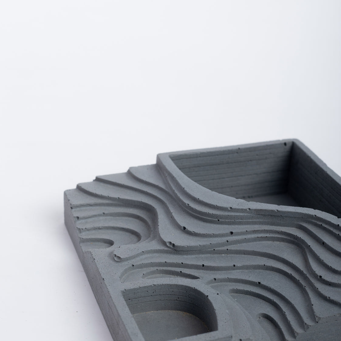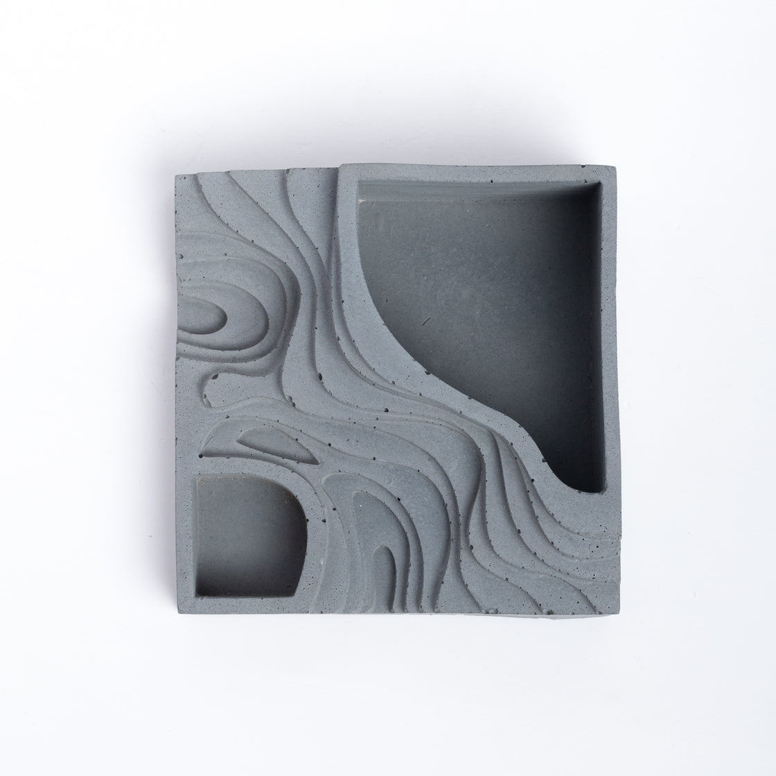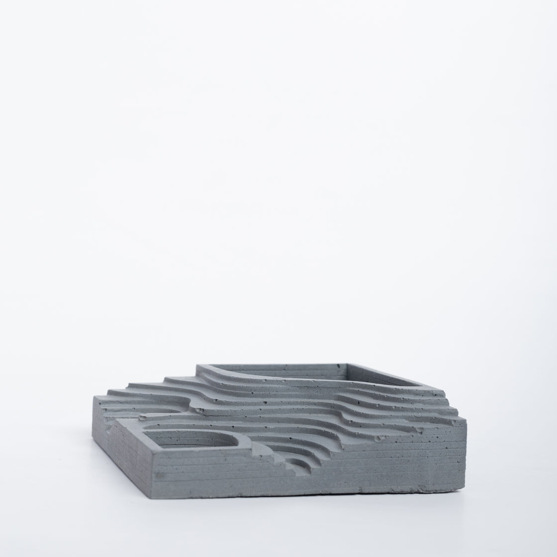 The square base features a pattern inspired by a not so steep terrain interpreted as contours. The contours gently descend downwards and open into another compartment. The classic design can be a decor accessory like no other in your living area.
