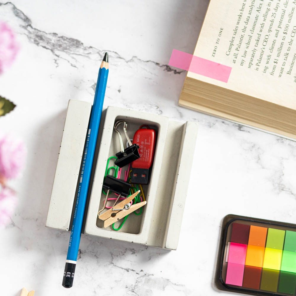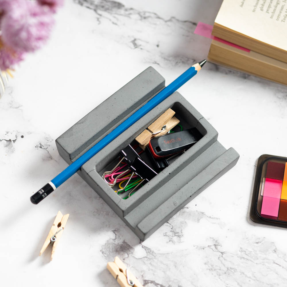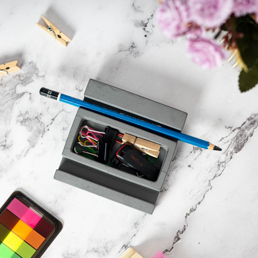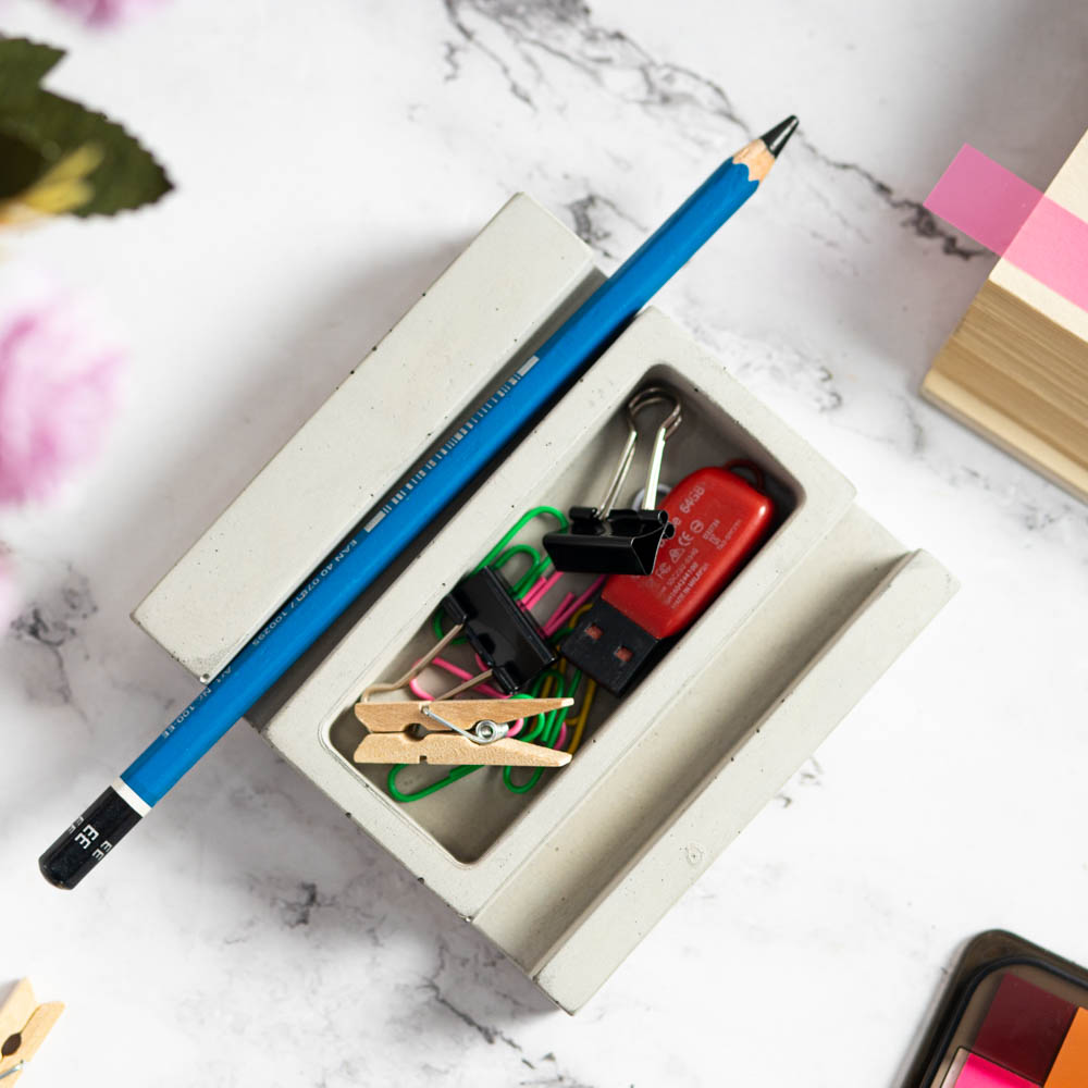 The crisp and sharp edges, with their subtle palette, make for a perfect work desk accessory for those who prefer things simple and sophisticated. Its rectilinear profile gives it a crisp silhouette. If minimal desk organizers with a monochromatic color palette are your thing, you must consider laying your hands on these concrete goodies. The simple design can easily be placed atop your table or drawer. Sturdy, sustainable concrete organizers are what you need to try if you haven’t already. The defined niches with the compartment in the middle are highly functional without any negative spaces.