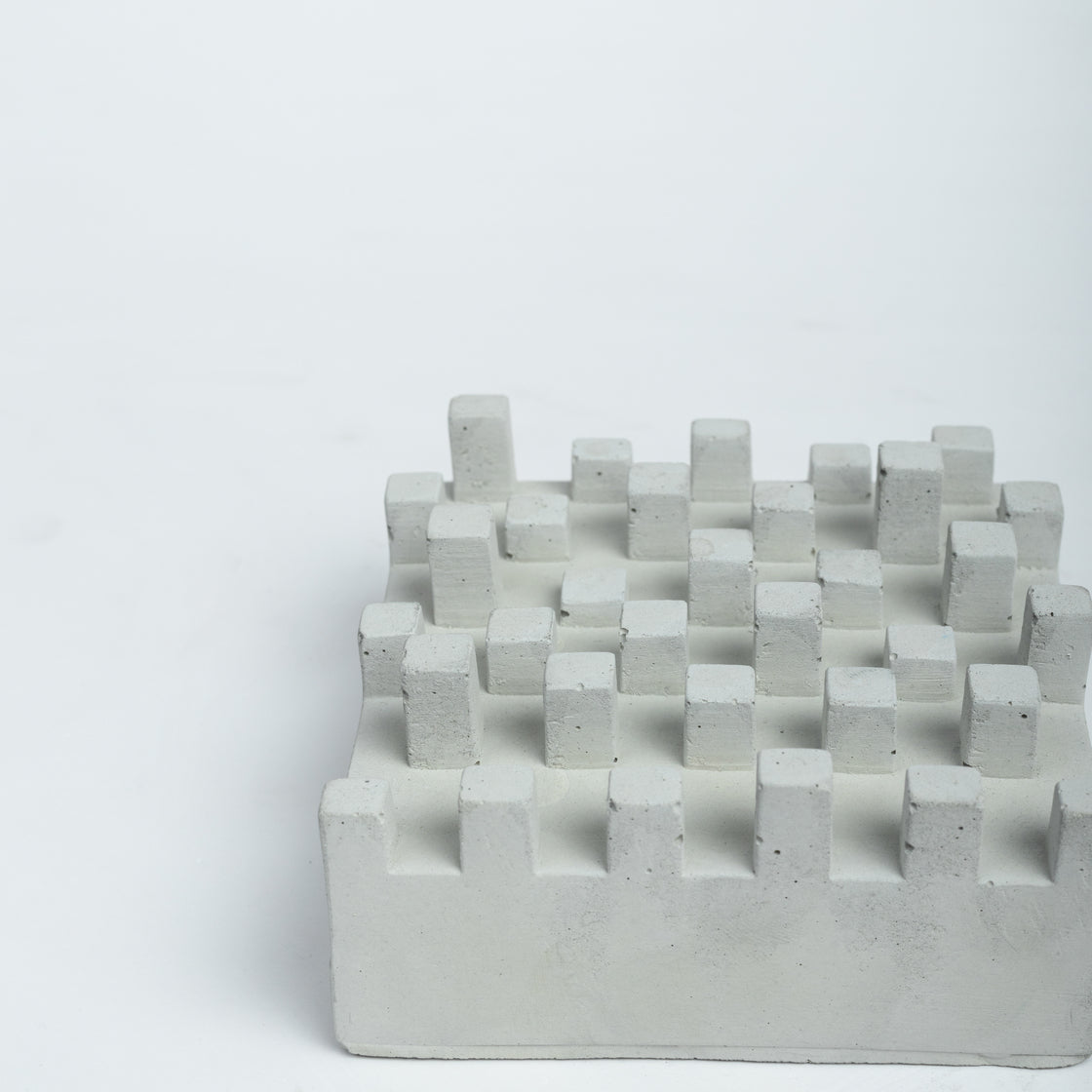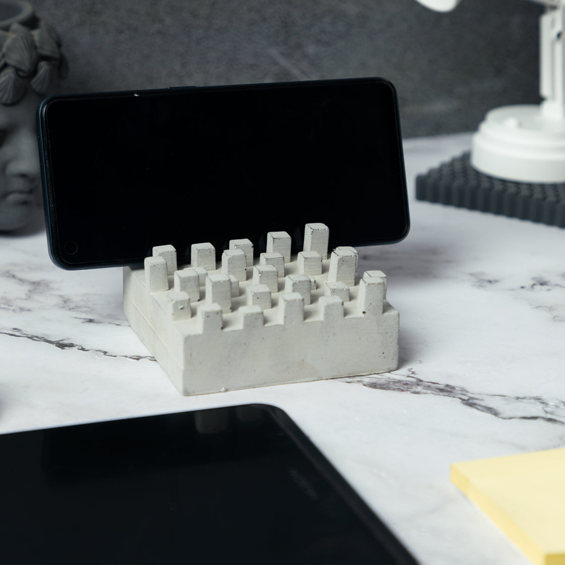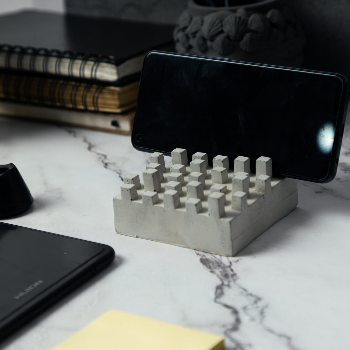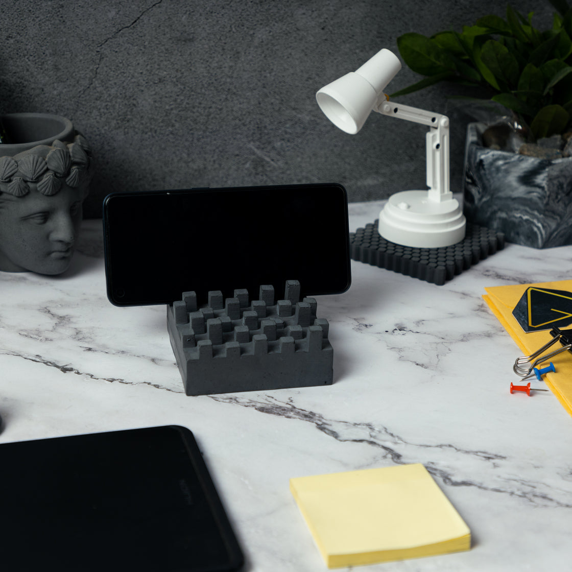 Kiss goodbye to the worries of your cell phone falling off. Shown here is a quality product that sits sturdy on your desk and even sturdily holds on to your device. Handcasted with Greytcrete, this contemporary design mobile stand looks elegant and delivers safety and sturdiness. The design seeks inspiration from a chess board. It exhibits the same in its square profile but with a monochrome palette. It has a modern, minimalist aesthetic that will serve its obvious purpose while also adding to your surroundings.
