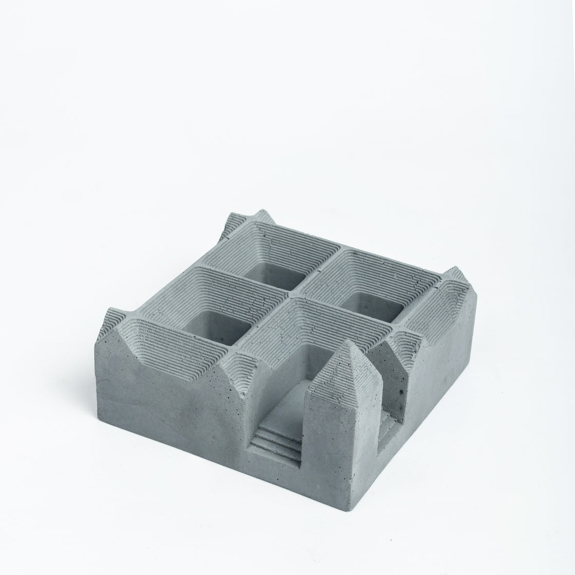 The square-shaped holder has a unique pattern, with a tiny tower rising above every other thing on the square island. The tower houses a square pyramid on top. Three square-shaped compartments of equal size are included in the holder. Although they are spacious enough to hold multiple items together, the sections allow for the separation and stacking of comparable items. Because of its versatile design, the holder can be used on your work desk, study table, bedside table, or bathroom.
