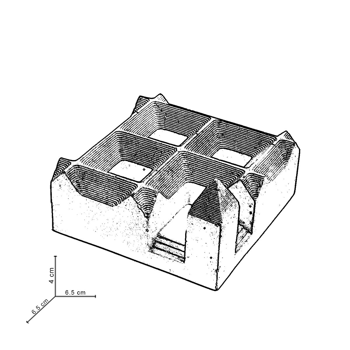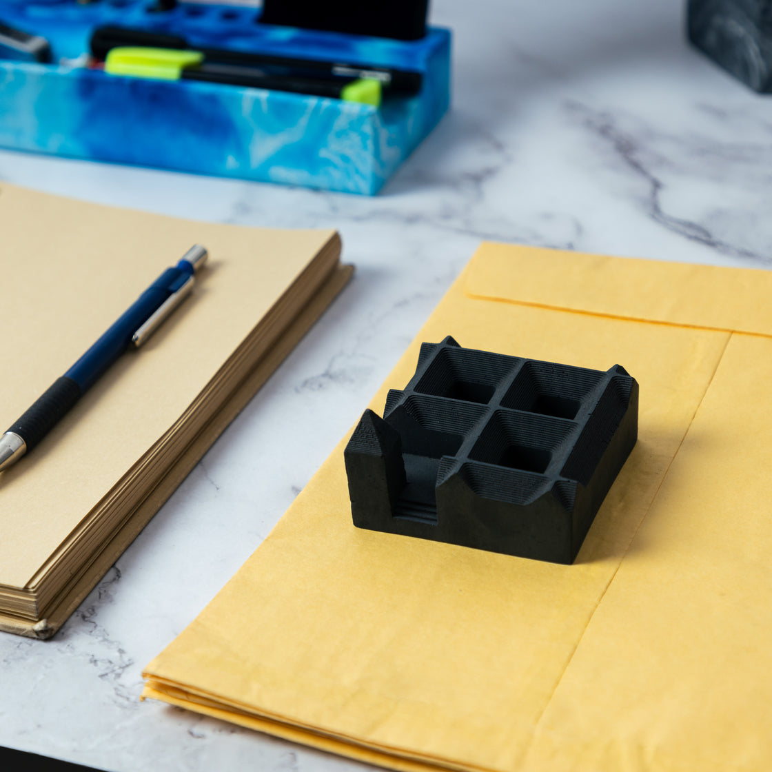 The square-shaped holder has a unique pattern, with a tiny tower rising above every other thing on the square island. The tower houses a square pyramid on top. Three square-shaped compartments of equal size are included in the holder. Although they are spacious enough to hold multiple items together, the sections allow for the separation and stacking of comparable items. Because of its versatile design, the holder can be used on your work desk, study table, bedside table, or bathroom.