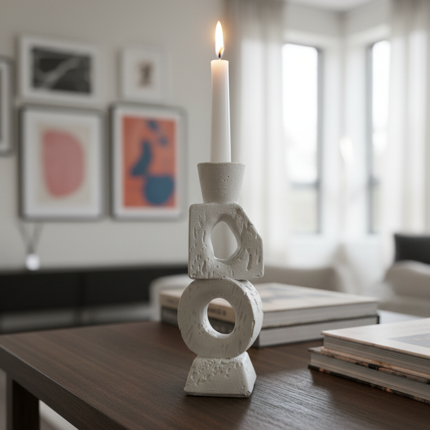 A sculptural masterpiece that doubles as a functional accent, The Abstract Form Taper holder embodies modern artistry. Composed of individually shaped and stacked concrete elements, each piece features a unique cutout, adding depth and visual intrigue. Its raw, textured finish in a light, natural tone complements the warm glow of a taper candle. This piece is perfect for adding an artistic, contemporary statement to a living room, dining table, or entryway console.