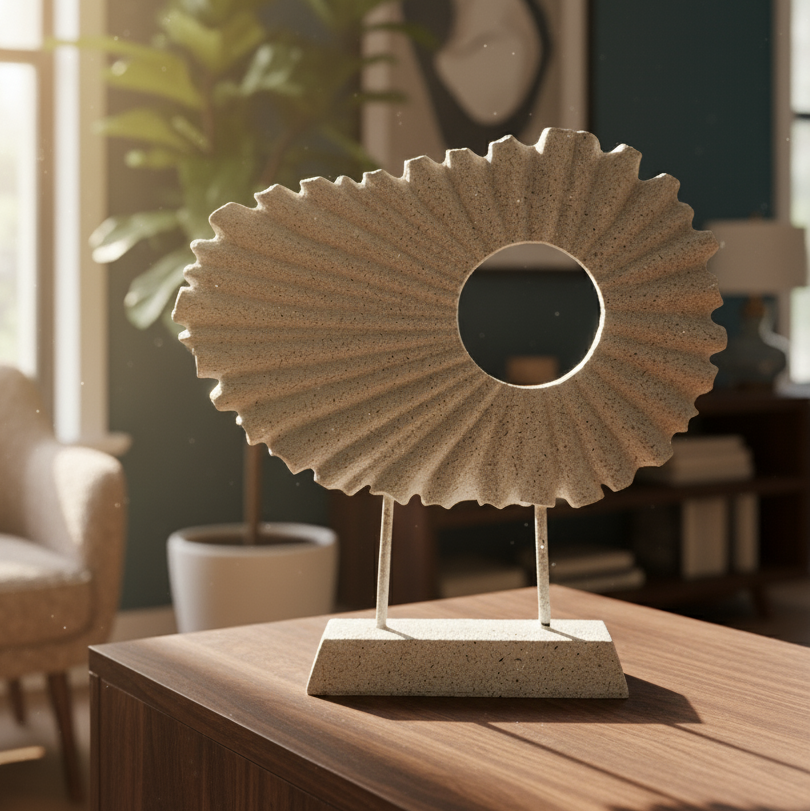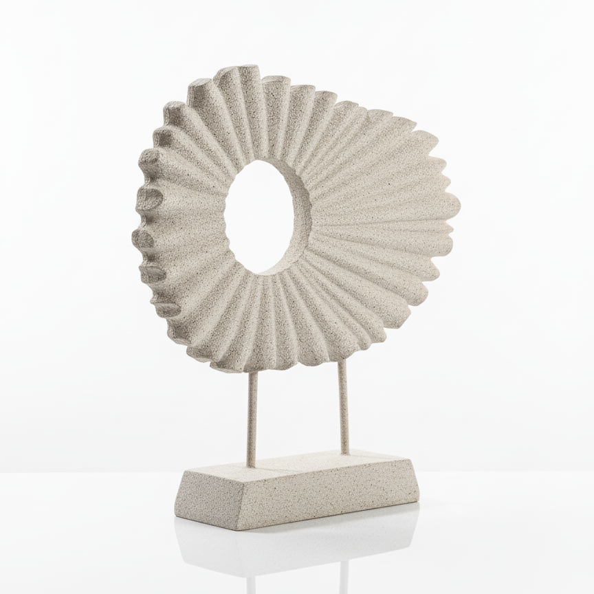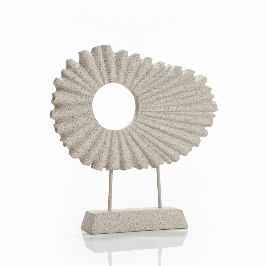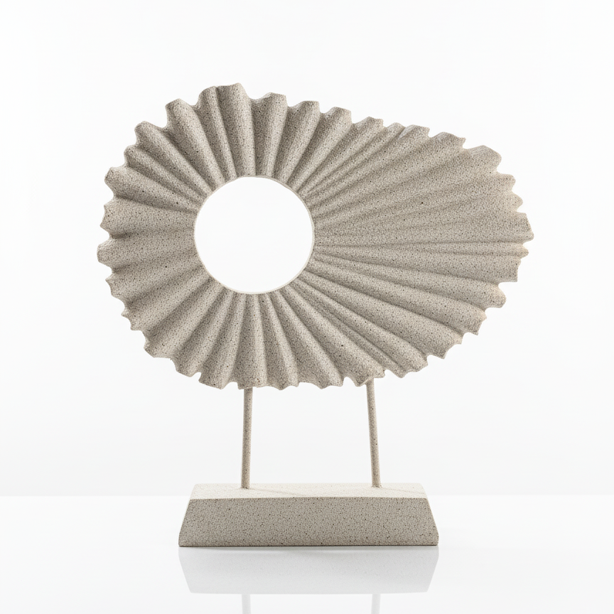 Elevate your decor with The Fan Stand, a stunning piece that captures rhythmic movement in a static form. Crafted from lightweight, durable resin, the sculpture features a bold circular shape defined by a captivating, fan-like corrugated texture. Resting securely on a minimalist base, this piece is designed to be a contemporary focal point. Use it to add an architectural, artistic touch to your bookshelf, mantel, or entryway table.