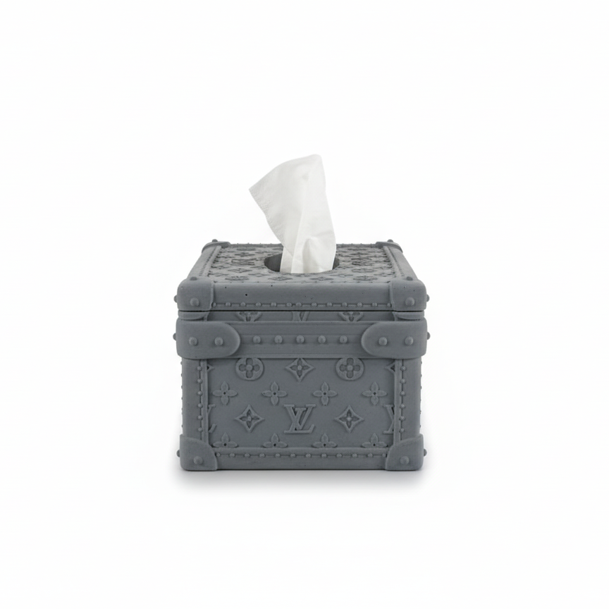 Transform necessity into luxury with The LV Valise Caddy. Inspired by classic, Louis Vuitton-style trunks, this tissue box cover features a richly textured, embossed pattern and structured form, complete with faux brass corner details. It's the perfect statement accessory to introduce designer-inspired elegance and refined character to any luxury setting.